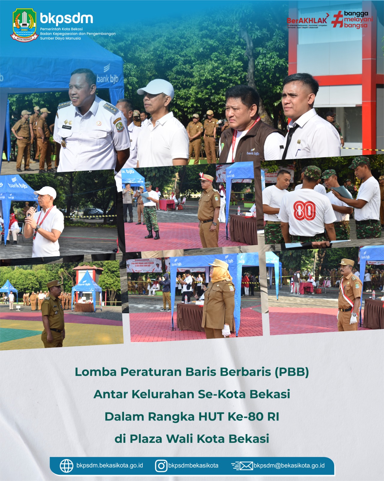 Dalam rangka memperingati Hari Ulang Tahun ke-80 Kemerdekaan Republik Indonesia, Pemerintah Kota Bekasi melalui Badan Kepegawaian dan Pengembangan Sumber Daya Manusia (BKPSDM) menyelenggarakan Lomba Peraturan Baris Berbaris (PBB) antar Kelurahan se-Kota Bekasi. Kegiatan ini diikuti oleh 56 kelurahan dan digelar di Plaza Wali Kota Bekasi pada Rabu, 27 Agustus 2025.
