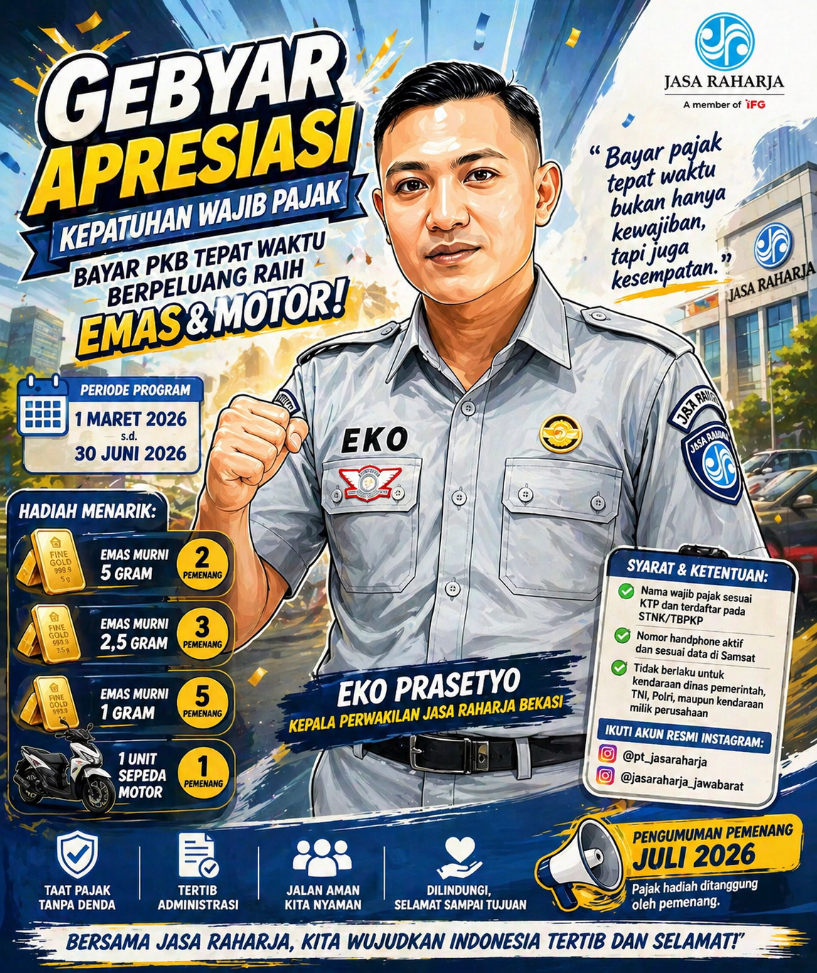 Jasa Raharja kembali menunjukkan komitmennya dalam mendorong kepatuhan masyarakat terhadap kewajiban pajak kendaraan bermotor melalui program Gebyar Apresiasi Kepatuhan Wajib Pajak. Program ini berlangsung mulai 1 Maret hingga 30 Juni 2026, dengan hadiah menarik berupa emas hingga sepeda motor bagi wajib pajak yang taat.