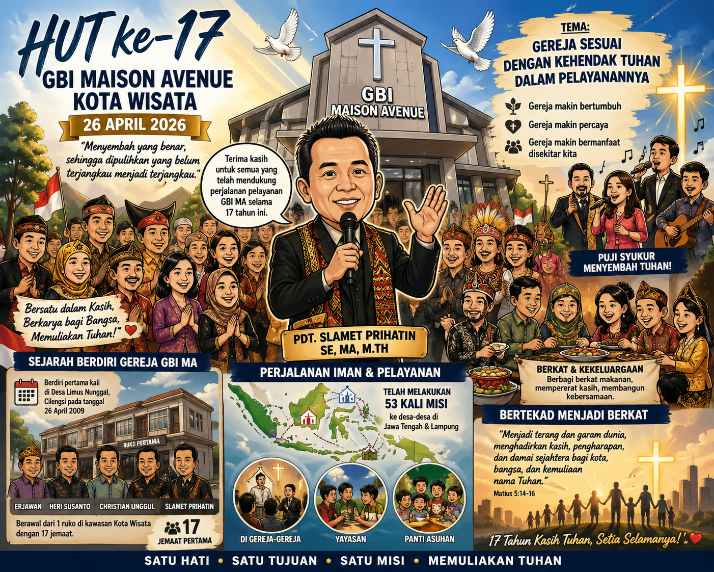Dalam kesempatan tersebut, Pendeta Slamet Prihatin, SE., MA., M.Th. menyampaikan rasa terima kasih dan apresiasi kepada seluruh pihak yang telah mendukung terselenggaranya acara ini dengan penuh dedikasi. Ia menegaskan bahwa perjalanan 17 tahun ini adalah bukti nyata kasih dan penyertaan Tuhan yang tidak pernah berhenti.