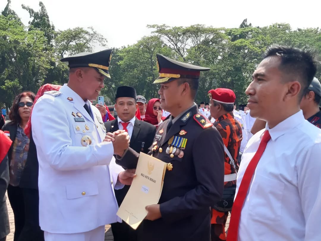 Unit Reskrim Polsek Bekasi Selatan menerima penghargaan dari Pemerintah Kota Bekasi pada upacara bendera peringatan HUT ke-80 Republik Indonesia yang digelar di Alun-alun M. Hasibuan, Kota Bekasi, Minggu (17/08/25).