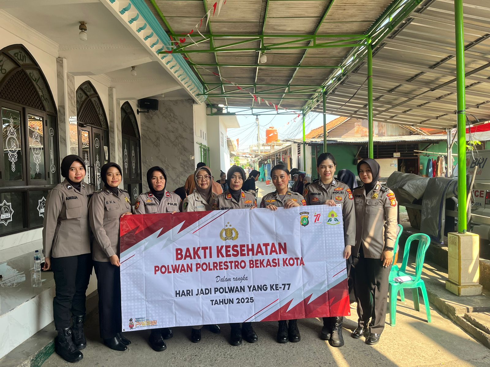 Dalam rangka memperingati Hari Jadi Polwan ke-77, Polwan Polres Metro Bekasi Kota melaksanakan kegiatan bakti kesehatan gratis untuk masyarakat di Masjid Mukaromah, RW 26 Kelurahan Pekayon, Kecamatan Bekasi Selatan. Acara yang berlangsung sejak pukul 09.00 WIB ini berjalan dengan tertib dan lancar, serta mendapat sambutan hangat dari warga setempat.(28/8/25)